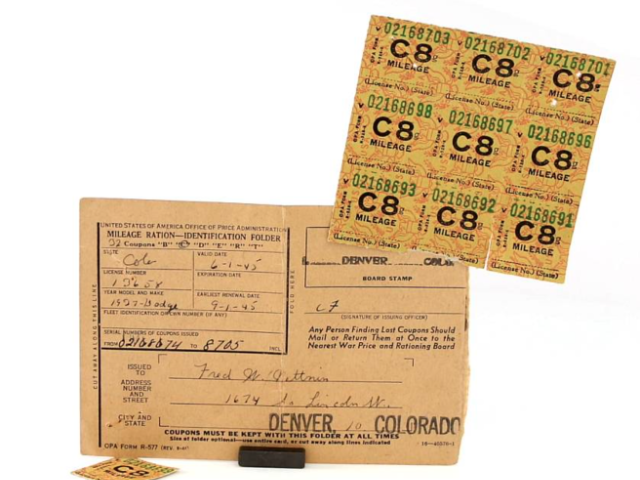 C8' Essential Mileage Ration Identification Folder and Coupons. Coupon book with 10 attached coupons issued to Fred W. Nettnin of Denver, CO. (No 242902); Valid June 1 through Sept 1, 1945; Office of Price Administration forms R-577 and R-526-K.