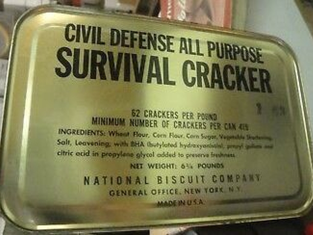 An early version of the survival cracker project was launched in 1955 by President Eisenhower’s Federal Civil Defense Administration. Named “Grandma’s Pantry,” under the justification that Grandma was always prepared for unexpected company, the program called for each household to have a ready supply of food and water in case of attack. In response, the Eisenhower administration looked to develop a food that was nutritious, cheap, easy to eat, shelf-stable, and reproducible on a mass scale. All other attributes, including taste, would be disregarded in favor of the ultimate survival food, one that could be stored underground indefinitely. The general public began to stock up on such products, like this tin of Survival Crackers.