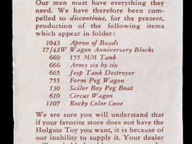 This is a notice from Holgate Brothers Company providing information from the company to retail stores about discontinuing certain toys in an effort to comply with wartime limitations. Primary Source ID EF.05.50.R