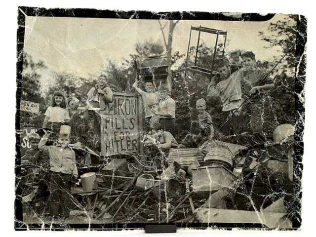 Photo of children on a heap of scrap metal and a sign that reads, 'Iron Pills for Hitler.' Primary Source ID EF.05.48.R