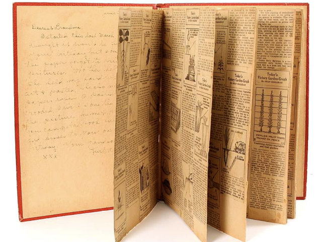 This is a scrapbook filled with newspaper articles and pictures about Victory Gardens made by 'Kurt, Age 3' and given to 'Dearest Grandma,' according to the inscription. Primary Source ID EF.05.57.A