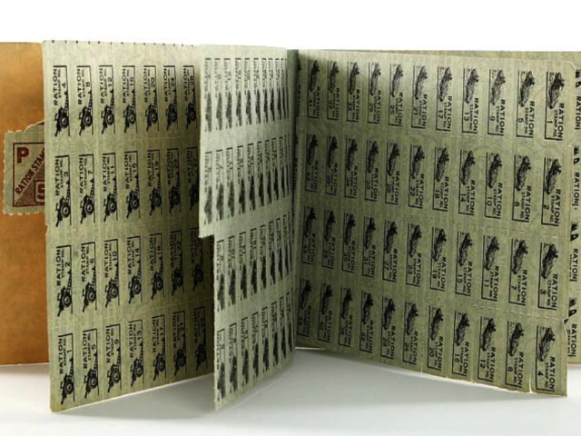 War ration books were produced by the United States Office of Price Administration in 1942 when United States officially entered the Second World War. Shortages of essential war materials such as rubber, gasoline, and sugar were initially anticipated, but soon rationing grew to include food as well as fuel and sugar. War ration book no. 3, valid September 1943, included 8 pages of stamps, four for meat rationing, and four for a clothing rationing program never put into effect. Some clothing stamps were eventually validated for shoe rationing.