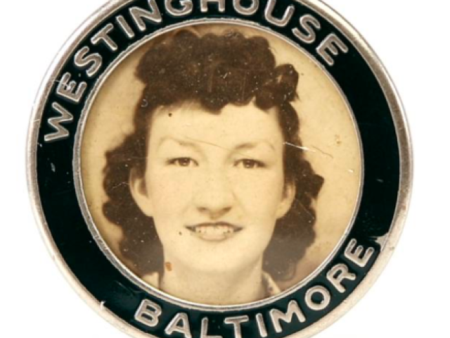 This Westinghouse Baltimore Employee Badge measures 1.5 inches wide, and is missing its back pin. Badge is original. Photo is replica. Primary Source ID EF.08.04.R